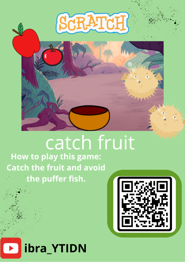 welcome to my website now you can see a game the name of the game is catching fruit your mision is catch 5 appel and avoid the puffer fish i made this scatch i made this 1 week because i sick 3 days because i get diare. the of code of game is so dificulty the enemy of the game is pufer fish why i use pufer fish because the shapes like water mine  how to play this game catch 5 appel and avoid the puffer fish if you touch your point -1 if you catch the appel your point +1 if you want to win catch 5 appel